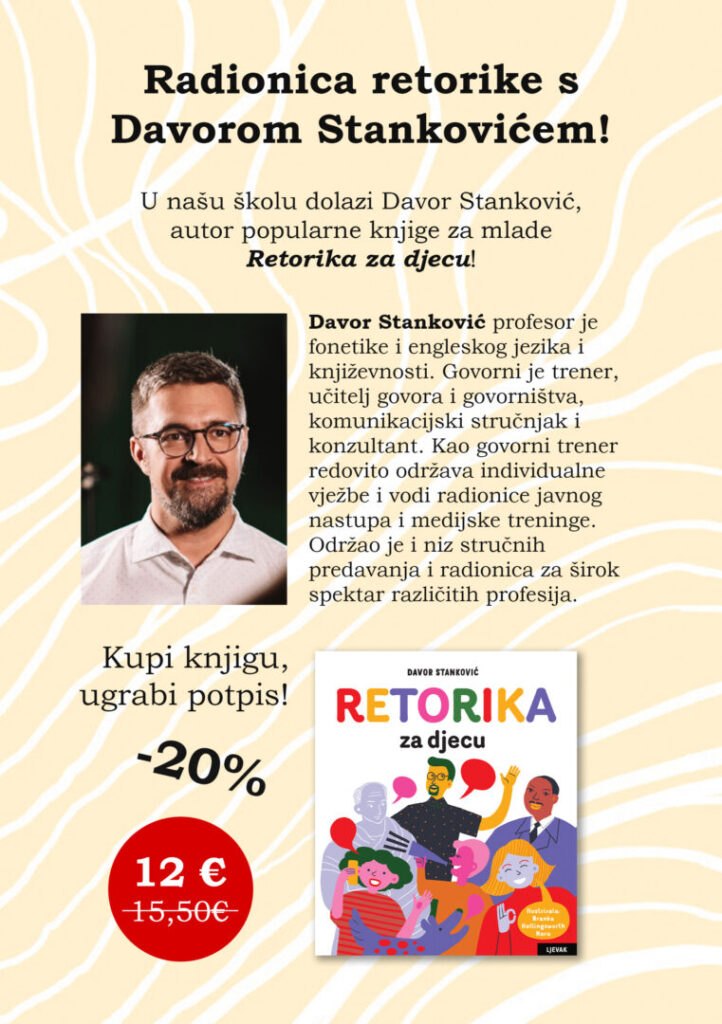Školska knjižnica u suradnji s Nakladom Ljevak organizira radionicu retorike s Davorom Stankovićem u petak, 13. veljače 2026. četvrti školski sat.